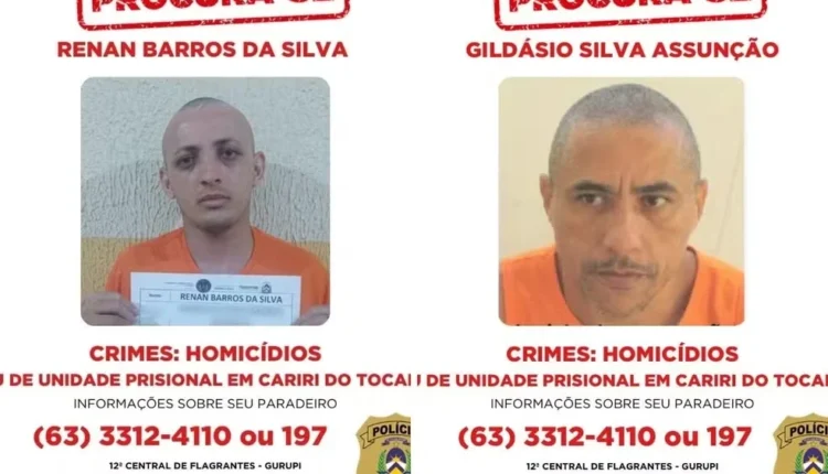 Dois detentos considerados de alta periculosidade seguem foragidos há um mês após fugirem da Unidade de Tratamento Penal de Cariri do Tocantins, no norte do estado. A fuga ocorreu em 25 de dezembro e envolveu Renan Barros da Silva, de 26 anos, condenado por uma série de homicídios em Araguaína, e Gildásio Silva Assunção, de 47 anos, que também responde por homicídio.