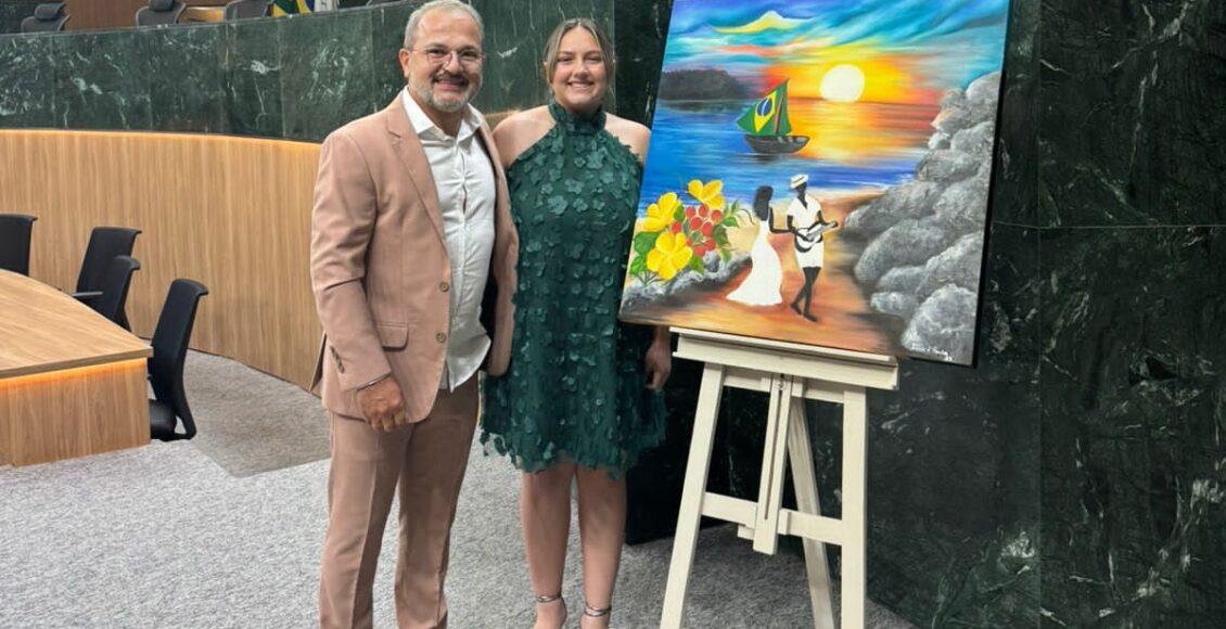 Na Assembleia Legislativa de Goiás, a jovem artista plástica Júlia de Paula Proença, de 15 anos, entregou uma obra de arte ao músico Ecio Duarte durante uma sessão solene. Ecio, reconhecido por sua música considerada para o Grammy Latino, colaborou com Júlia na arte da capa de seu álbum “AOS PARES – SamBão”. Este evento celebrou a intersecção de música e arte visual e destacou talentos emergentes do Brasil.