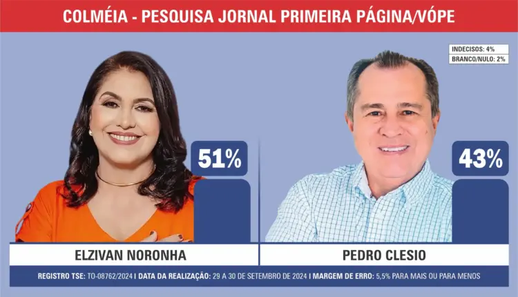 Com as eleições municipais marcadas para o próximo domingo, dia 06 de outubro, a segunda pesquisa de intenção de voto para prefeito em Colméia, conduzida pelo Jornal Primeira Página e seu instituto, o Vópe – Voz e Pesquisa Tocantins, apresenta o cenário da disputa eleitoral.
