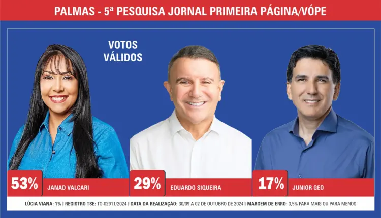Com 53% dos votos válidos, última pesquisa do Jornal Primeira Página/Vópe em Palmas mostra que Janad Valcari pode vencer no 1º turno
