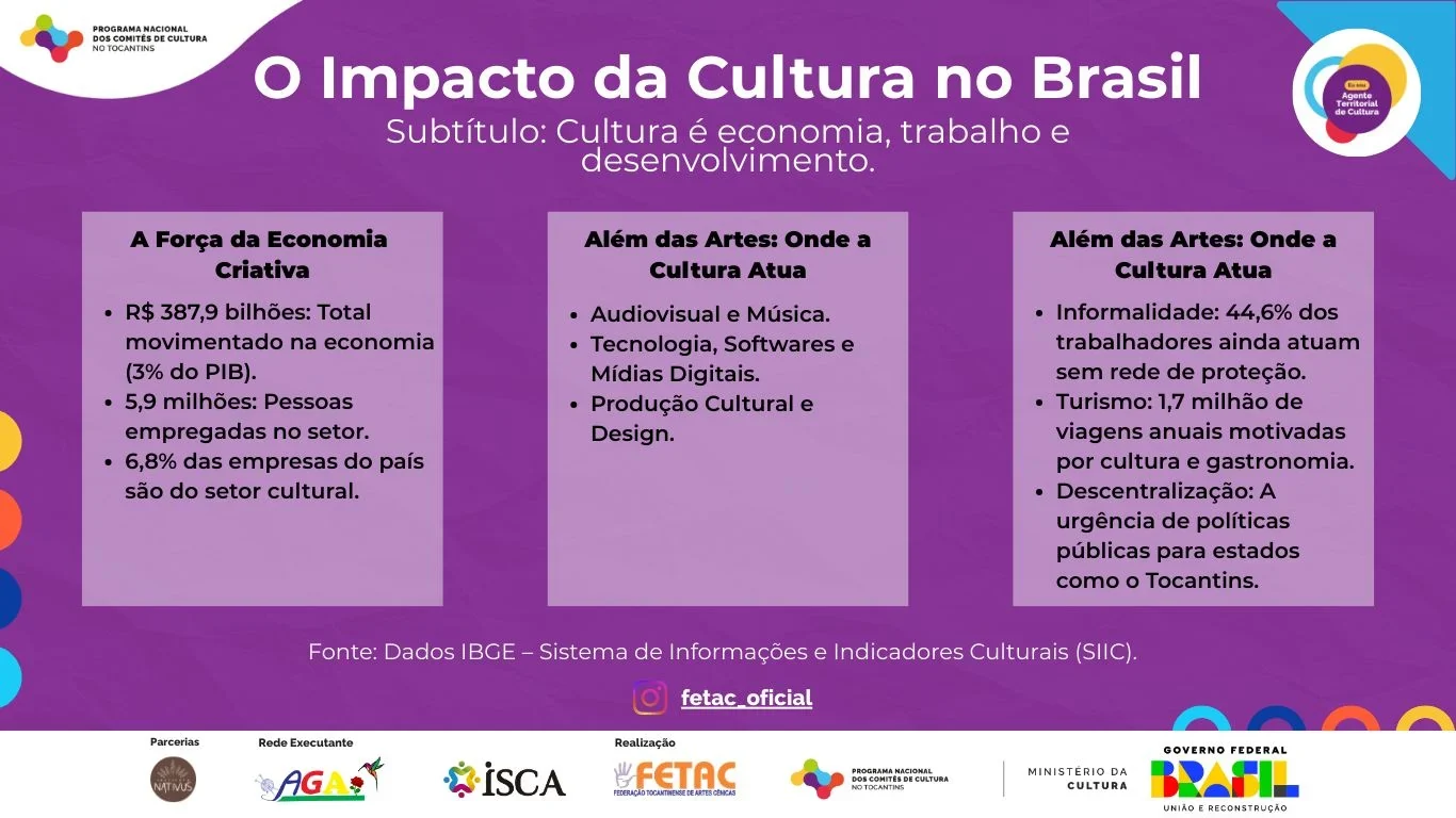 Apesar da participação econômica do setor, os dados apontam alto índice de informalidade. Em 2024, a cultura reuniu 5,9 milhões de trabalhadores, o que corresponde a 5,8% do total de pessoas ocupadas no país. Desse total, 44,6% atuavam em ocupações informais e 43% trabalhavam por conta própria.