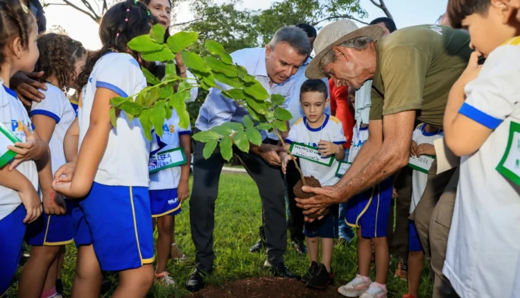 Como parte da programação, o prefeito realizou o plantio de uma muda no Bosque dos Pioneiros, acompanhado por alunos do Cmei Cantinho do Saber.