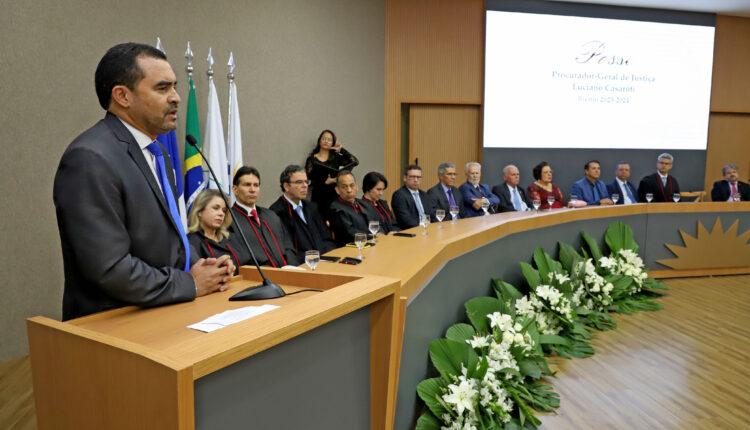 O governador do Tocantins, Wanderlei Barbosa, participou da posse do procurador-geral de Justiça (PGJ), Luciano Casaroti, em cerimônia realizada na quinta-feira, 26, na sede do Ministério Público do Tocantins (MPTO), em Palmas. O evento oficializa a recondução do PGJ para o biênio 2023-2024, após reeleição e nomeação ocorrida ainda em outubro de 2022.