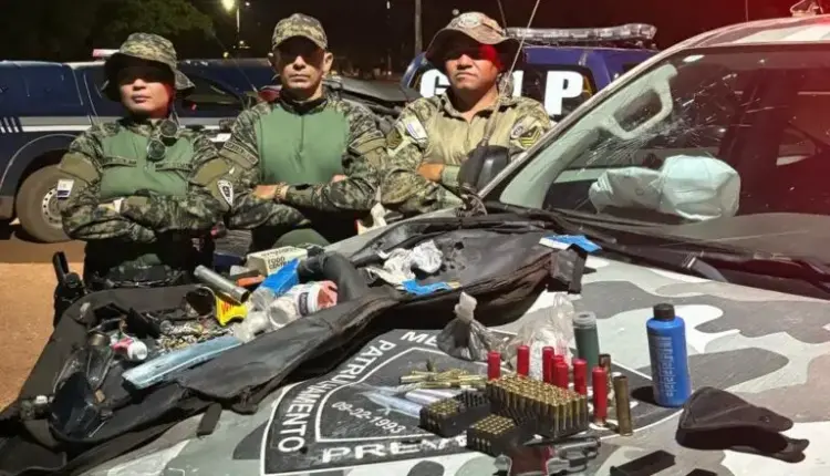 Durante a abordagem, foi constatado que o indivíduo apresentava sinais de embriaguez, como desorientação, fala desconexa e odor etílico. Em sua mochila, foram localizados diversos itens ilícitos: uma pistola calibre 6.35 mm, dois carregadores, 56 munições calibre 22, 66 munições calibre 38, munições de calibres 22 e 28, além de dois potes de pólvora (branca e preta), duas garrafas de bebida alcóolica quebradas, uma motosserra e um aparelho celular.