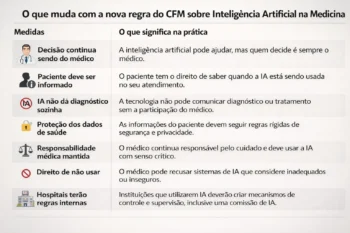 O Conselho Federal de Medicina (CFM) publicou no Diário Oficial da União, nesta sexta-feira (27), a Resolução nº 2.454/2026, que regulamenta o uso da inteligência artificial (IA) na medicina em todo o Brasil. A norma estabelece que a tecnologia poderá ser utilizada como ferramenta de apoio na prática médica, mas determina que a decisão final sobre diagnóstico, tratamento e prognóstico continuará sendo responsabilidade do médico.