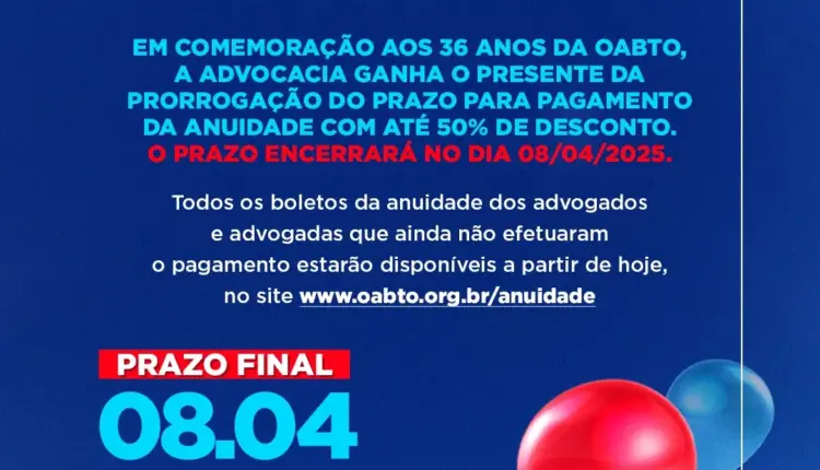 Em comemoração aos 36 anos da Ordem dos Advogados do Brasil – Seccional Tocantins, advogados e advogadas do Tocantins ganharam mais tempo para quitar a anuidade de 2025. A medida foi aprovada pelo Conselho Seccional na última sexta-feira, 21, que determina o novo prazo, que agora se estende até o dia 8 de abril.
