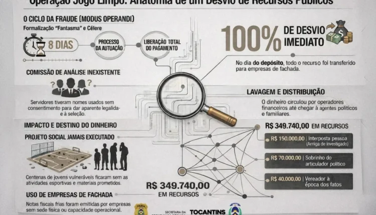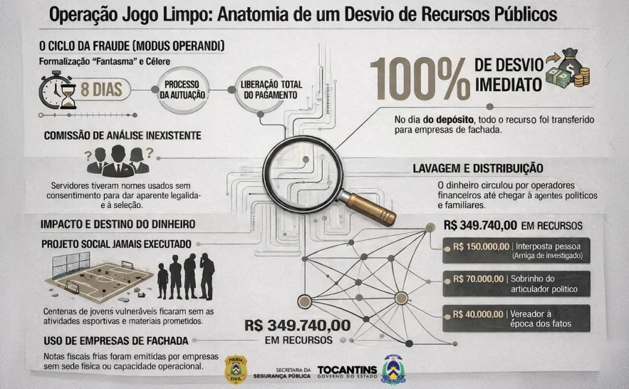 Segundo a investigação, parte dos recursos do Convênio nº 020/2014, firmado entre a Fundação Municipal de Esporte e Lazer (Fundesportes) e o Instituto Vale do Tocantins, no valor de R$ 349 mil, teria sido desviada no mesmo dia do repasse. O projeto “Atividade Física e Recreativa no Combate às Drogas”, que previa atendimento a jovens em situação de vulnerabilidade, não teria sido executado.