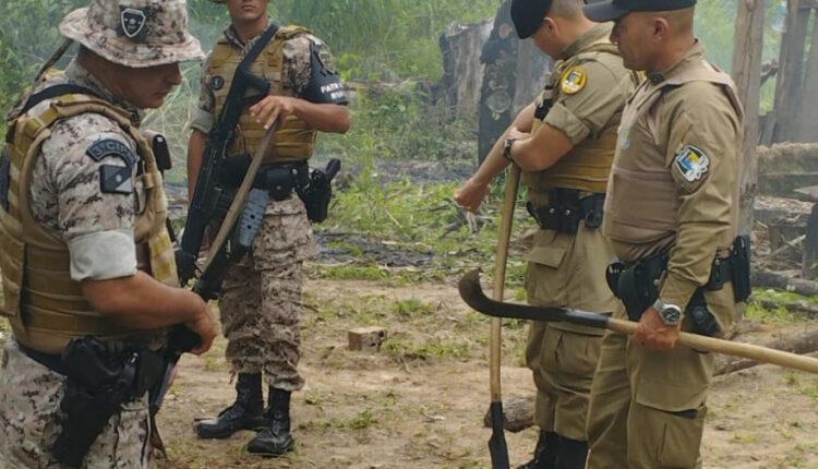 Após ser acionada para verificar uma possível invasão em propriedade rural particular, a equipe de polícia da 3ª Companhia Independente (3ª CIPM) desencadeou uma operação, conseguindo localizar os dois indivíduos que estavam ateando fogo, limpando o terreno e terminando a construção de um barraco.