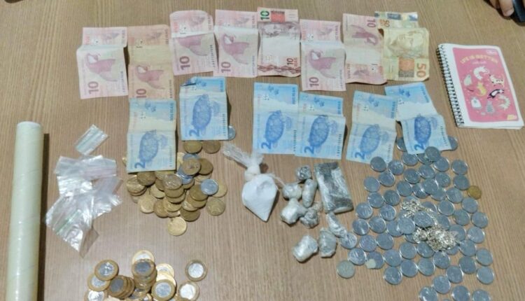 No total, foram apreendidos 48 gramas de substância análoga à maconha, 28 gramas de substância análoga à cocaína, R$ 221,35 em espécie e um celular.