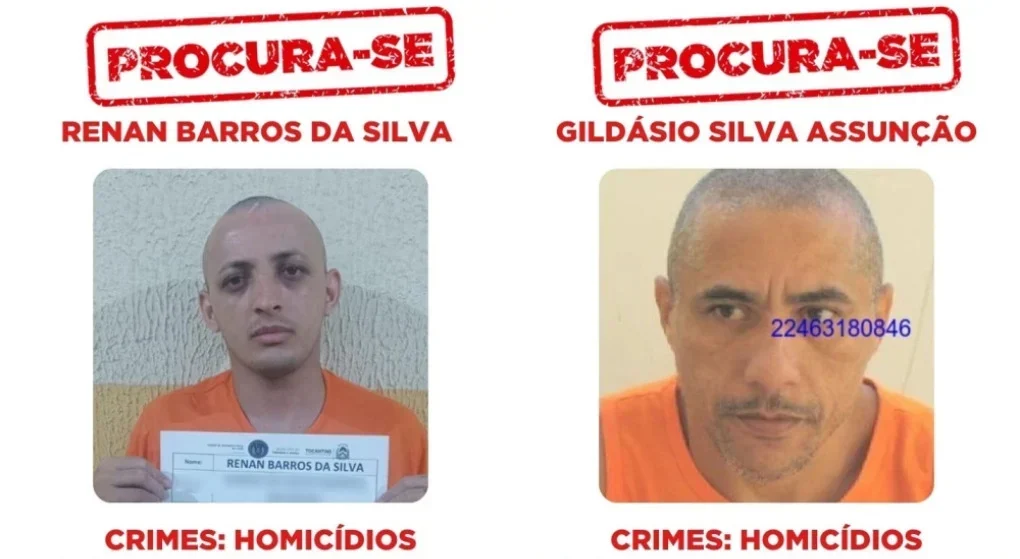 Dois detentos considerados de alta periculosidade fugiram na noite desta quinta-feira (25) da Unidade de Tratamento Penal de Cariri do Tocantins, na região sul do estado. Equipes da Polícia Civil e de outras forças de segurança estão em diligências para localizar Gildásio Silva Assunção, de 47 anos, e Renan Barros da Silva, de 26.