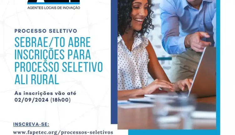 O Serviço de Apoio às Micro e Pequenas Empresas no Tocantins (Sebrae) realiza o processo seletivo para o programa Agente Local de Inovação (ALI) Rural para profissionais de nível superior. As inscrições, que são gratuitas, vão até às 18 horas (horário de Brasília) do dia 02 de setembro, por meio do portal da – www.fapetec.org -> Unidade de Seleção -> Processos Seletivos -> Processo Seletivo SEBRAE/TO – ALI 01/2024 -> Ver detalhes -> Edital e Comunicados.